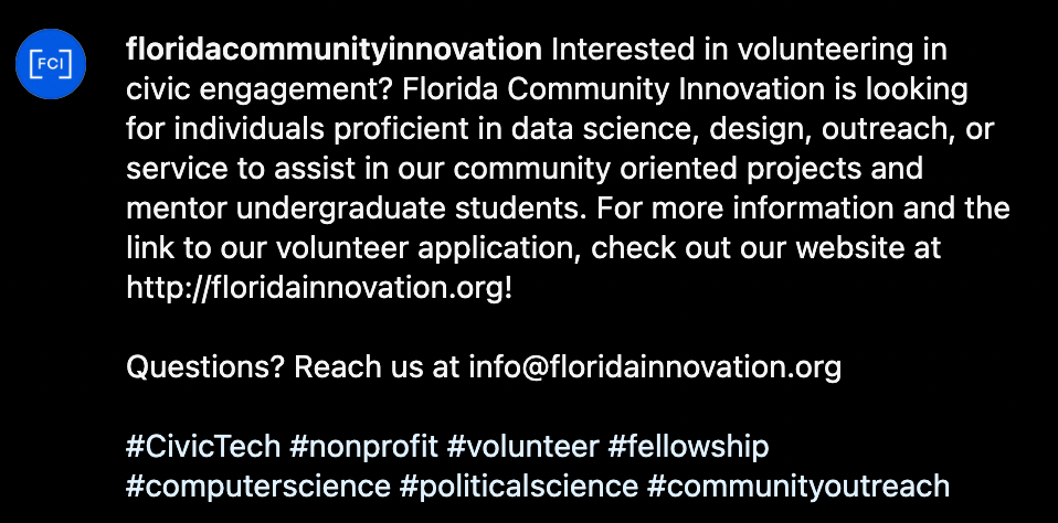 Florida Community Innovation (FCI) is a civic technology nonprofit based out of Central Florida. I became involved as a public affairs intern with FCI while in my undergrad. After assisting on several projects and reframing FCI’s social media with a strategic plan, I became a project manager for the nonprofit. After graduation, I was asked to join the board of directors, on which I currently serve.